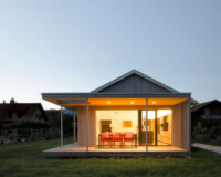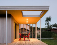 Cette maison de plain-pied est pensée pour deux personnes. Le rez-de-chaussée est surrélevé de quelques dizaines de centimètres au-dessus du terrain afin d’offrir un certain dégagement visuel et éviter la sensation d’écrasement du voisinage proche. Un deck extérieur permet de circuler le long de la façade ouest au propre et se dilate au sud afin de créer la terrasse. Cette dernière est un prolongement de l’espace intérieur grâce au grand vitrage fixe sud.